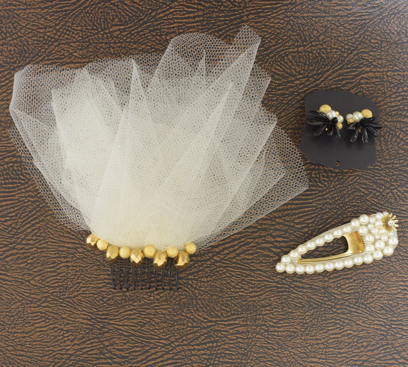 ・カラー リボン(白)ヘアクリップ(ゴールド・パール)ピアス(黒・ミックス)