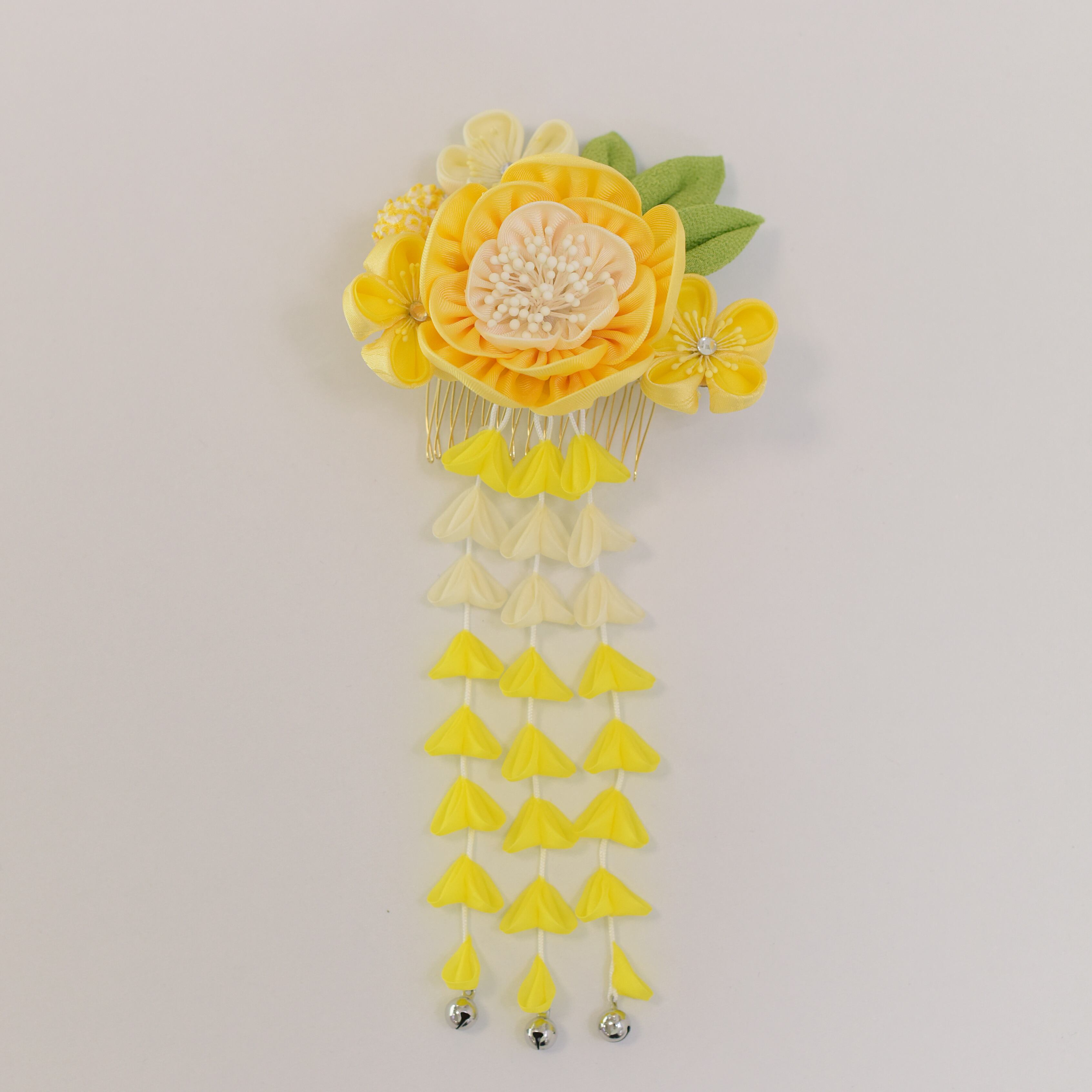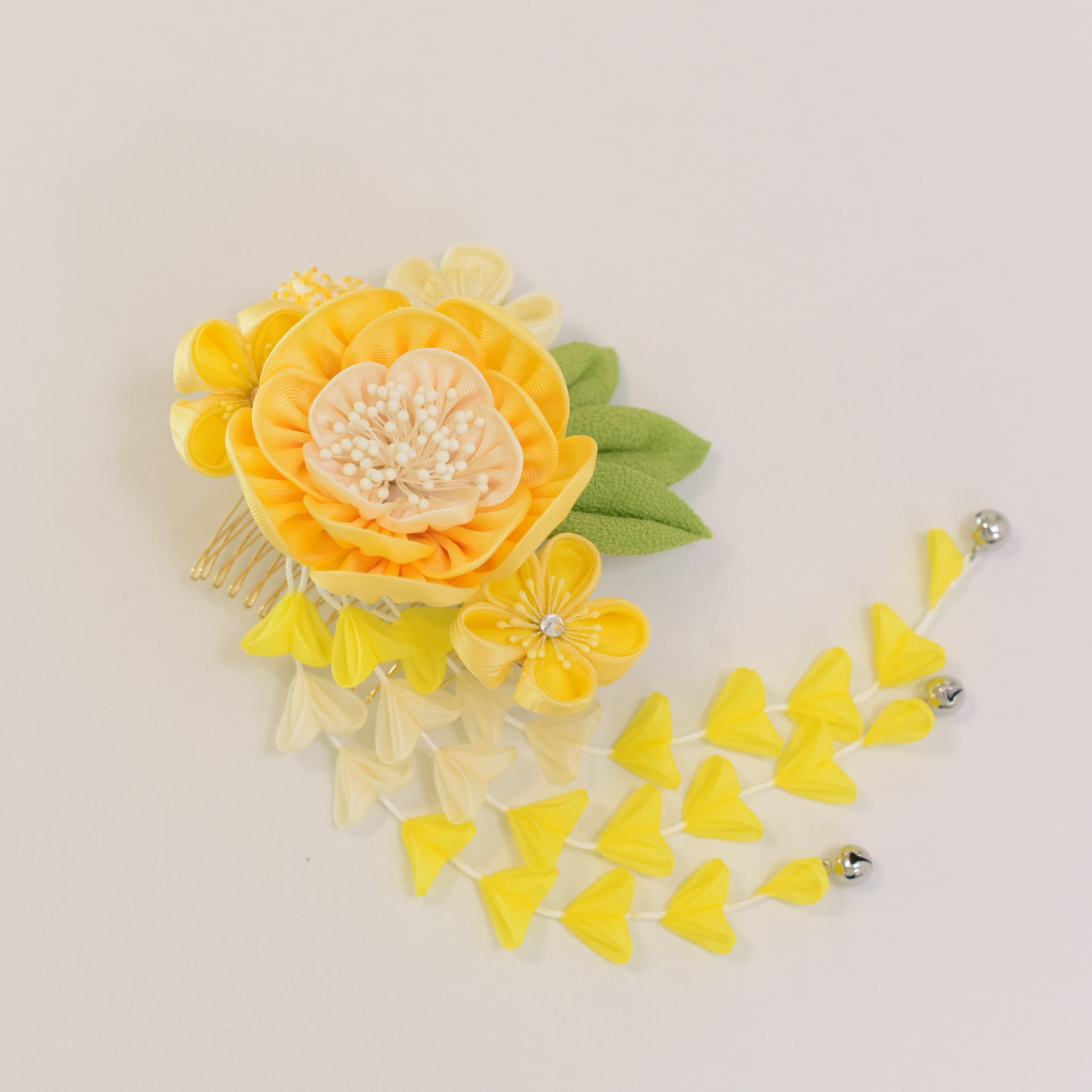牡丹の花のモチーフで鮮やかな黄色が印象的な花かんざしです。